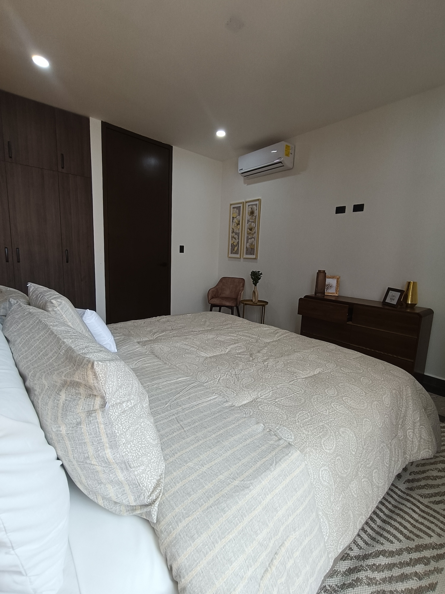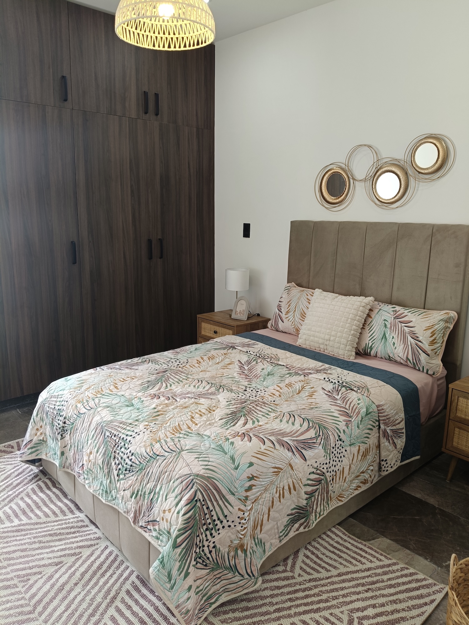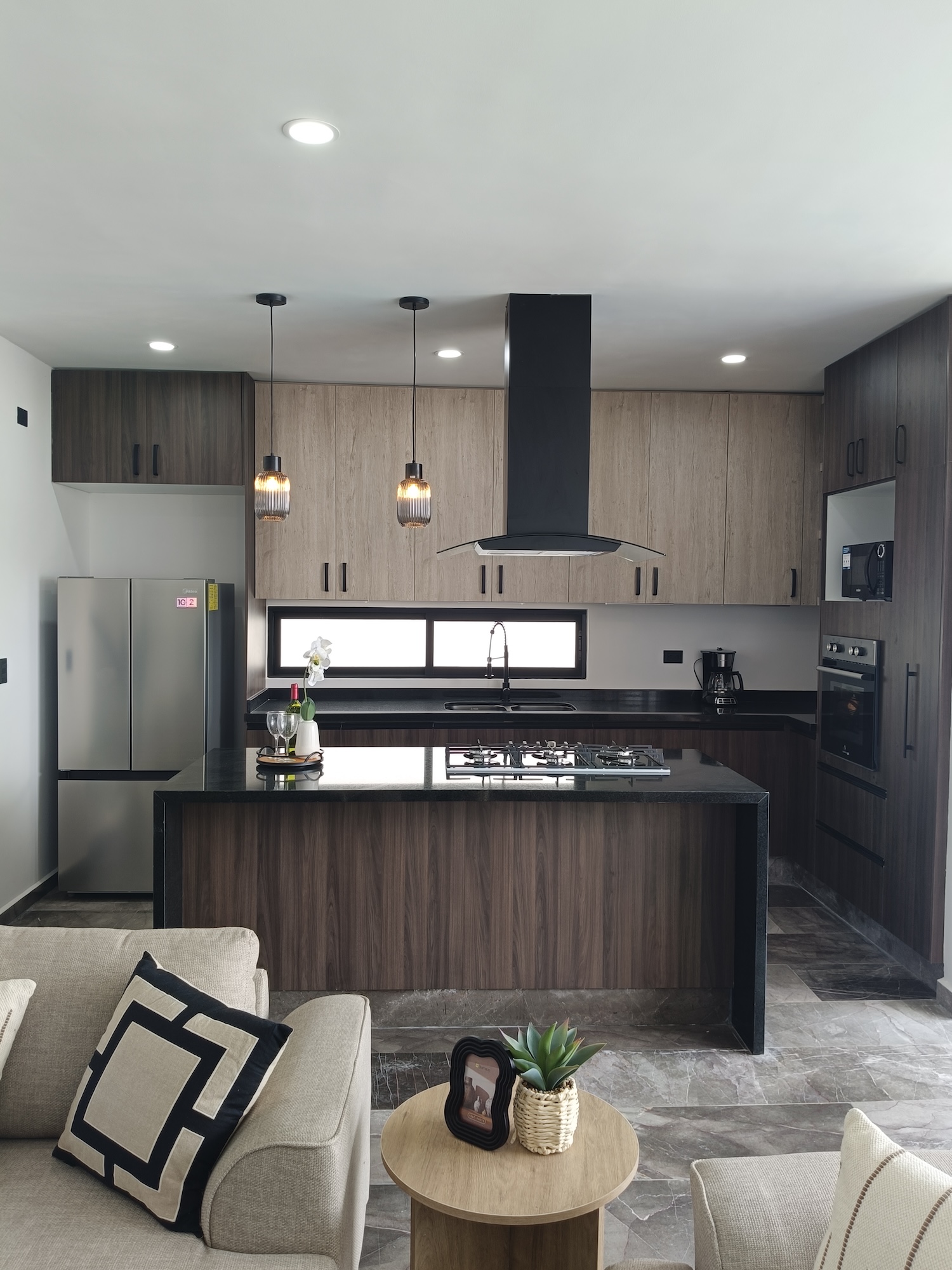 - Cocina integral equipada: horno empotrado, campana extractora, parrilla, tarja, mezcladora e isla con cubierta de granito